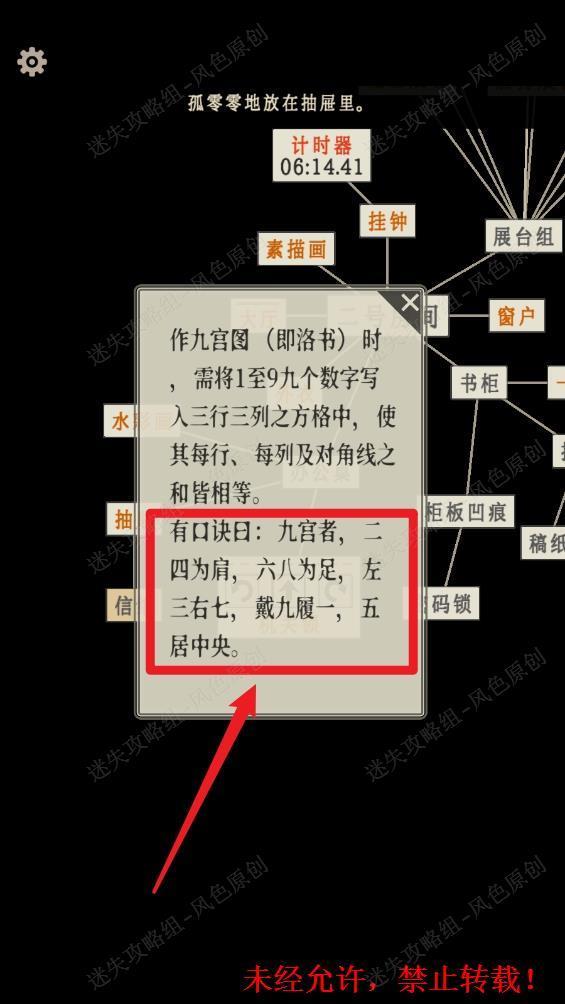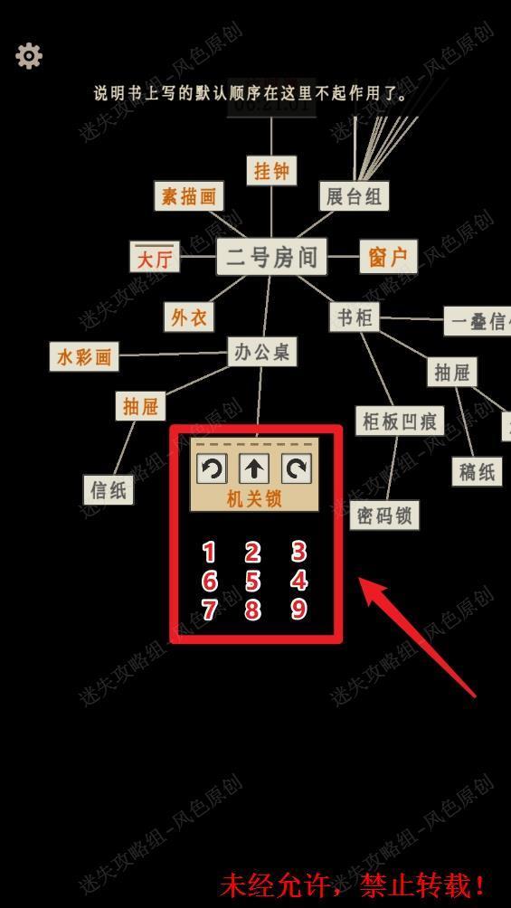 149.点击【机关锁】,按照九宫格中1-9的顺序来点击【机关锁】上的三个按钮,正确顺序为:逆时针→前进→顺时针→顺时针→前进→逆时针→逆时针→前进→顺时针。 149