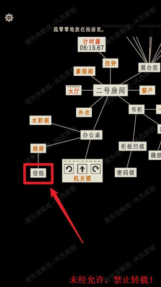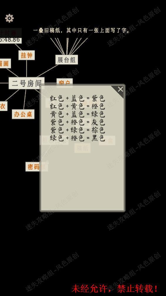 144.点击【书柜】→【抽屉】,阅读【稿纸】,获取有关于颜色的线索提示。