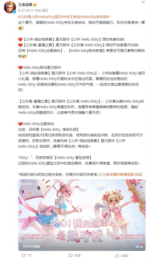 随着8月22日,《王者荣耀》发布了与HELLO KITTY的联动消息,并放出了精心制作的联动动画,从动画中我们可以看到《王者荣耀》为本次联动创作了全新歌曲、舞蹈,星元皮肤的制作也十分精美。然而就在玩家们猜测这样两款皮肤最终到底会定价多少的时候,《王者荣耀》表示两款皮肤都是可以在活动中免费获得的!其中小乔·缤纷独角兽-Hello Kitty星元可以通过游戏内的活动任务逐步获得全部部件,而公孙离·蜜橘之夏-Hello Kitty在活动刚开放时就能够使用紫星币兑换。