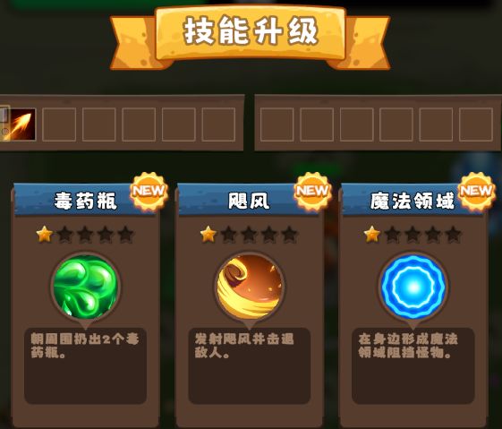 3、等级提升收集经验时屏幕上方的经验条会慢慢上涨,经验条满了之后就可以升级,每次升级都可在三个技能中选择一个,技能随机刷新,技能有可能是攻击技能,有可能是被动技能。