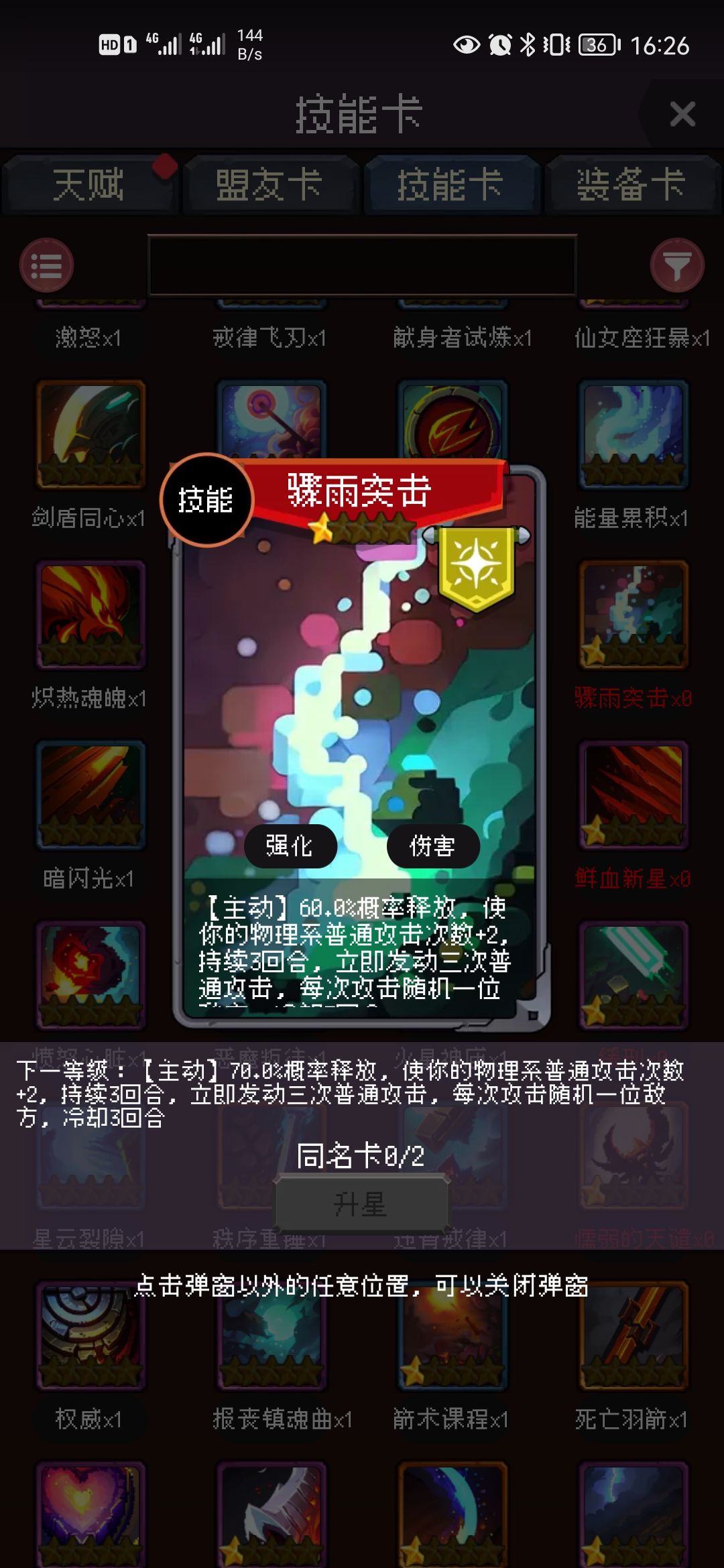 注:如果新手未通关困难难度,无法获取征服的天谴,可以尝试替换为【骤雨突击】(见下图)作为下位替代,每三回合大概率发动三次普攻。缺陷是骤雨突击附带的每回合物理普攻+2传刺无法触发,因为传刺是法术普攻。