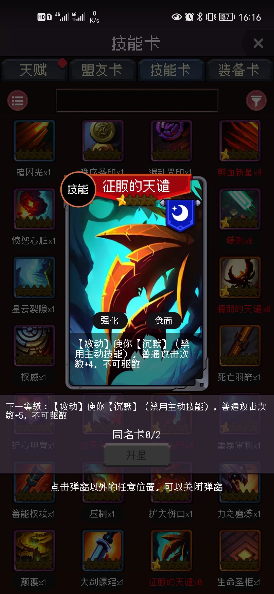 征服者的天谴:增加普攻次数,0星增加3次普攻/每回合,通关困难难度结局获取,每个结局1张,一共16张升至五星(对新手不友好)