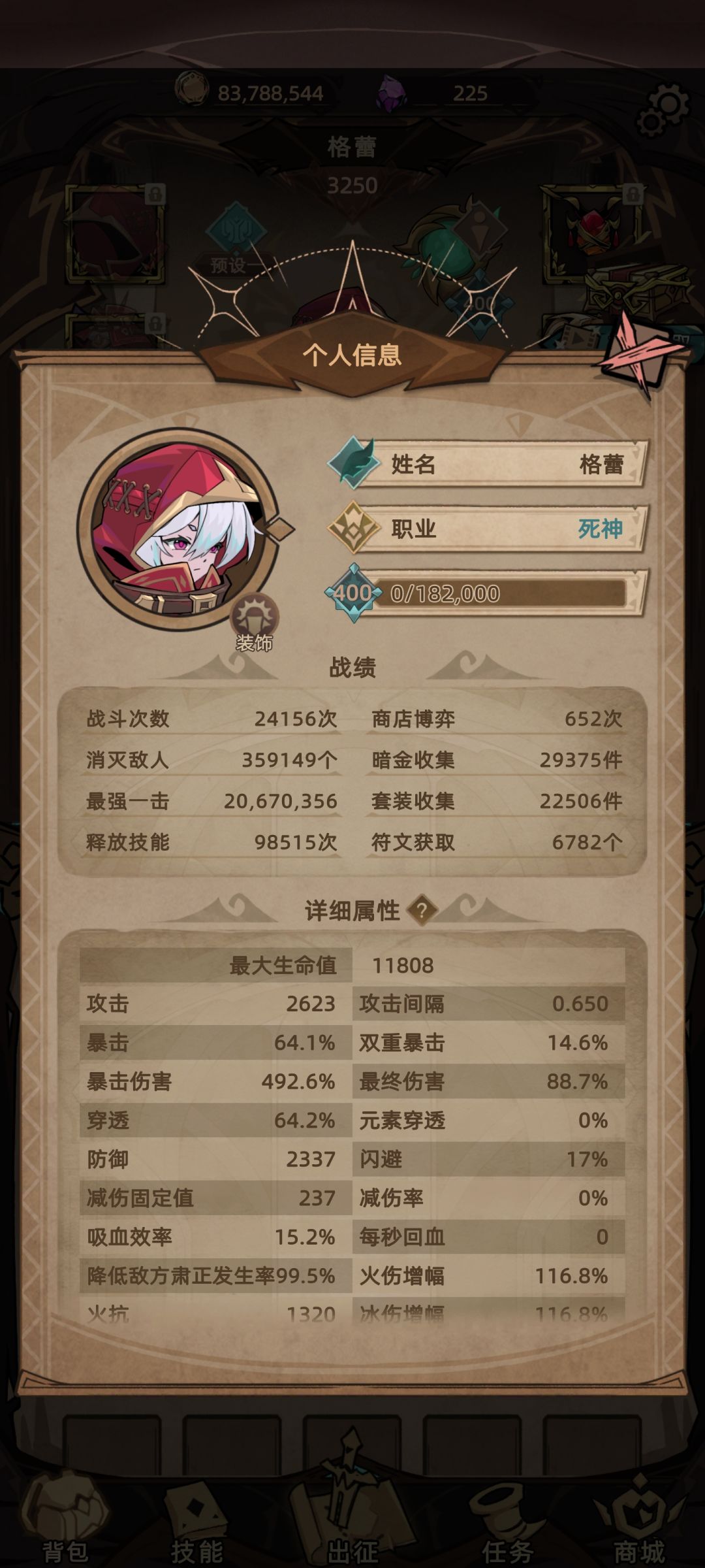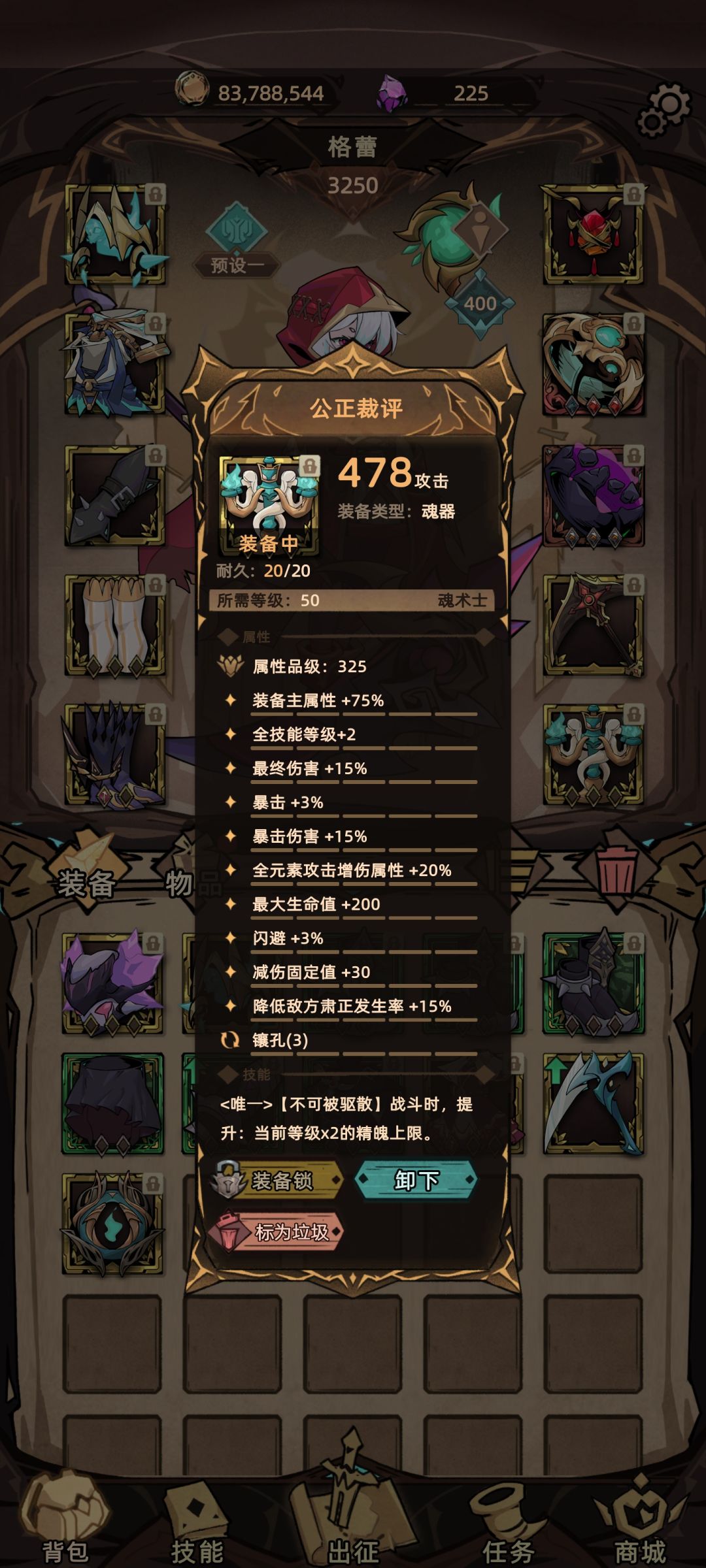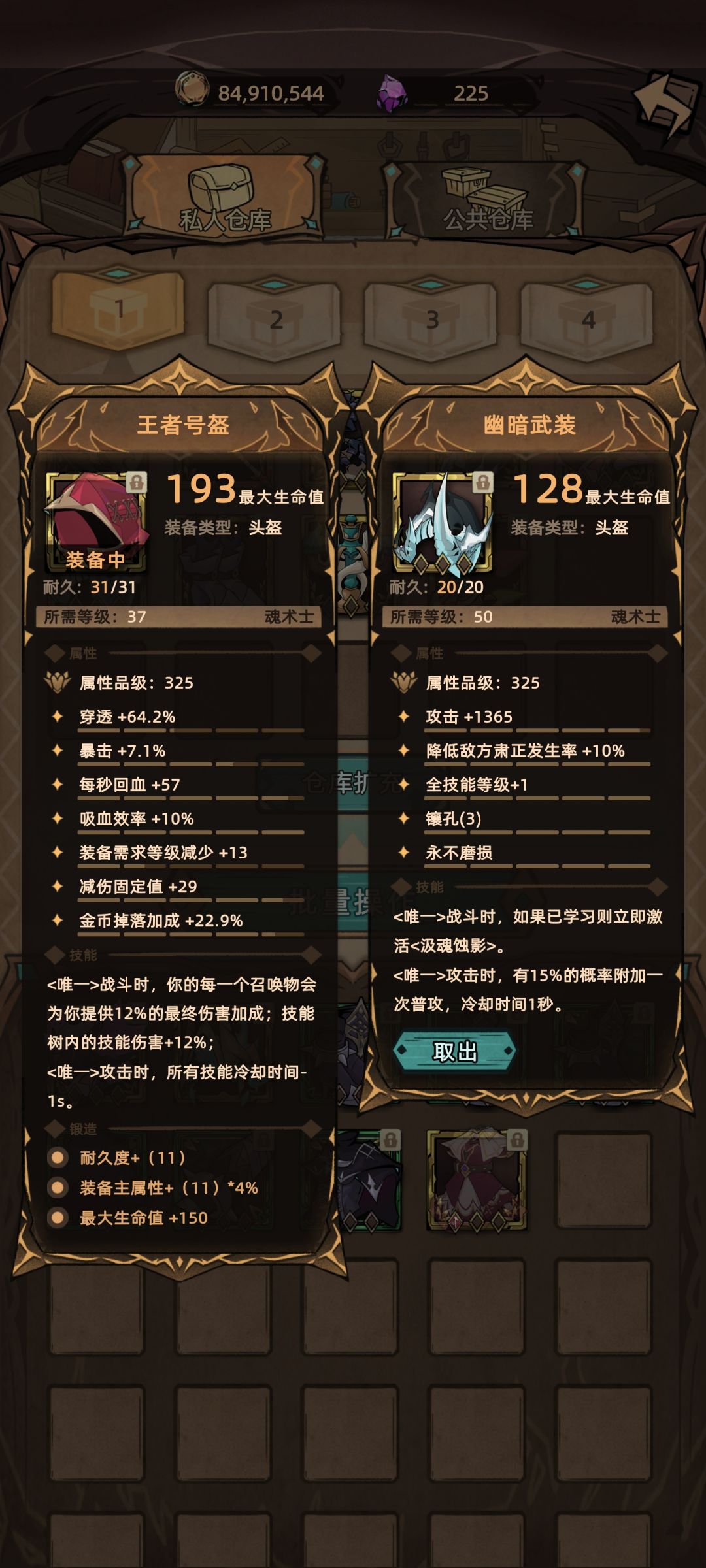 20%终伤 50%爆伤 还有全技能+2 暗金散件死神不需要依靠精魄 所以负面效果可以忽略不计