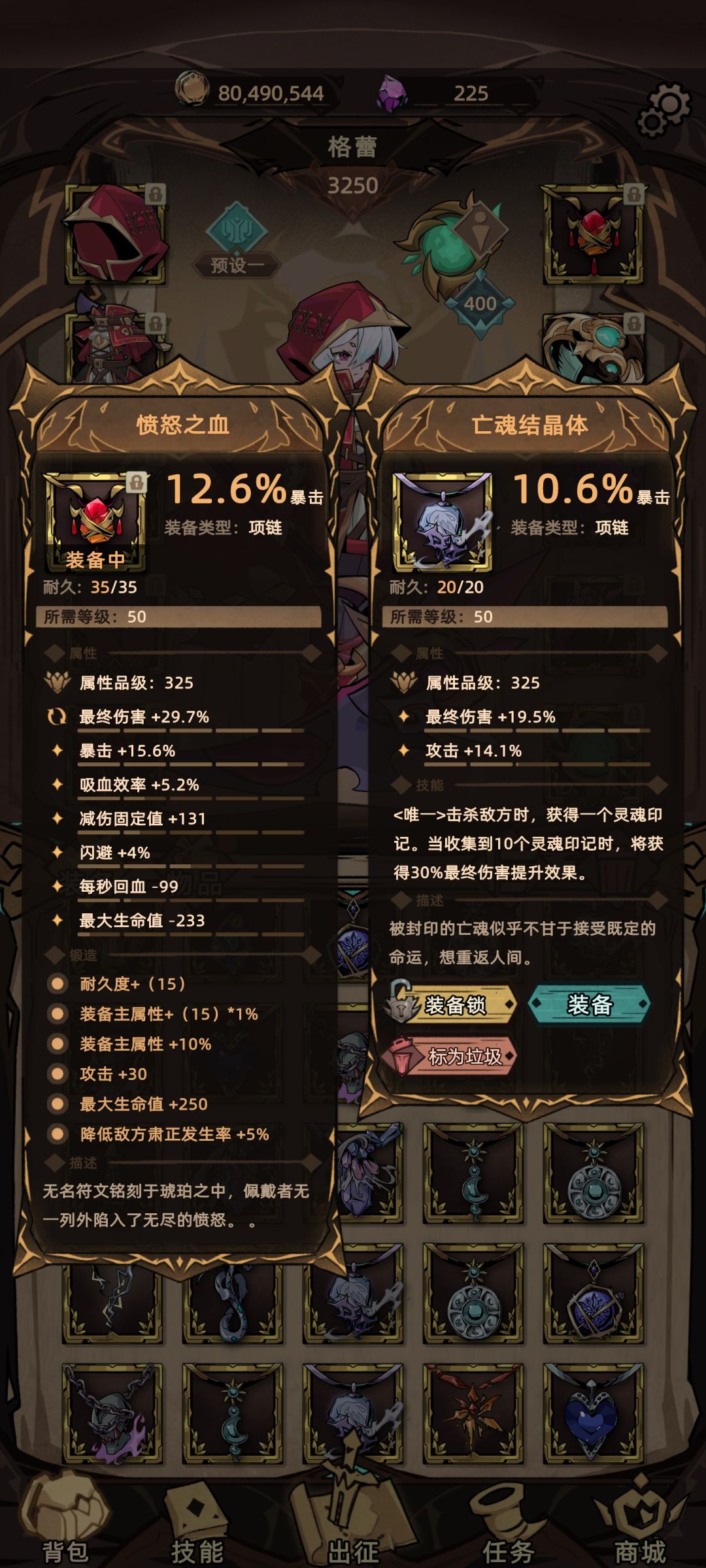 死神对于暴击要求比较低 所以不太需要神选 所以选择这个拥有30%终伤并且初始即拥有25%暴击的项链