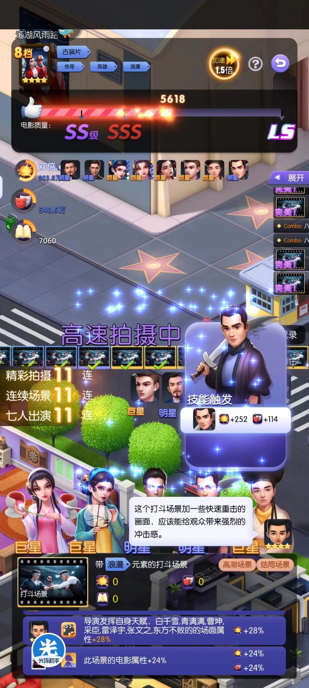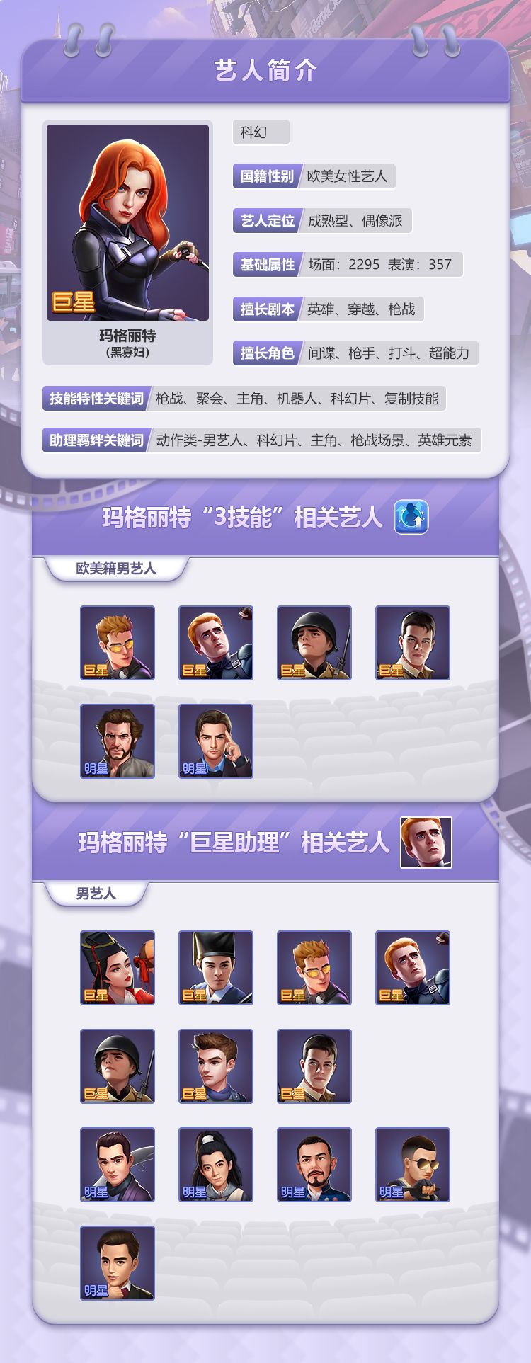想罗杰3技能、巨星助理触发属性增益,只需拍片时对应的艺人在该场景登场即可