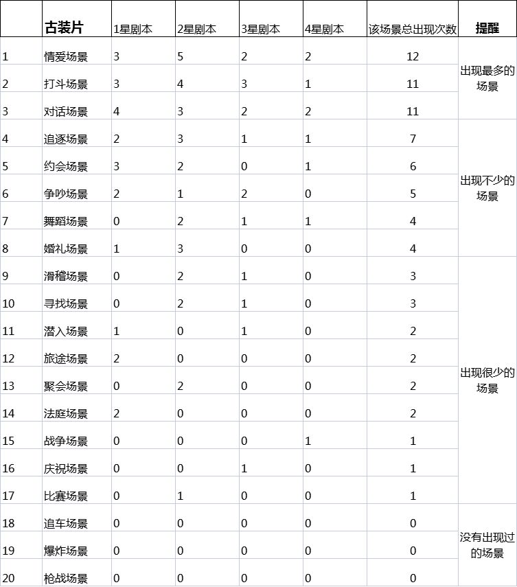 很多萌新刚入坑时,看见古装剧本中众多的场景不知道应该如何选择,下图是个人把内测时已经出了的剧本中的场...