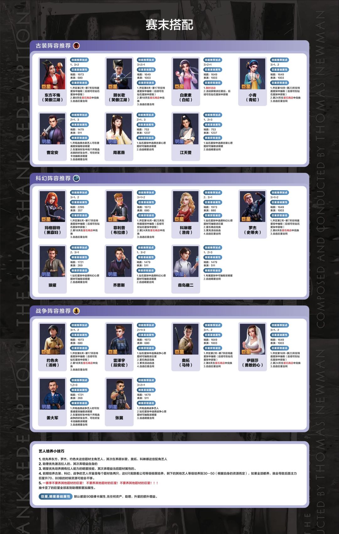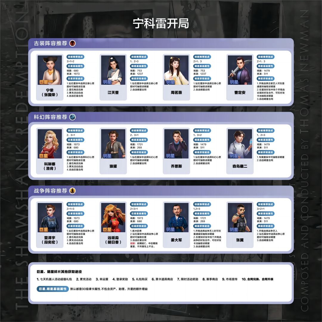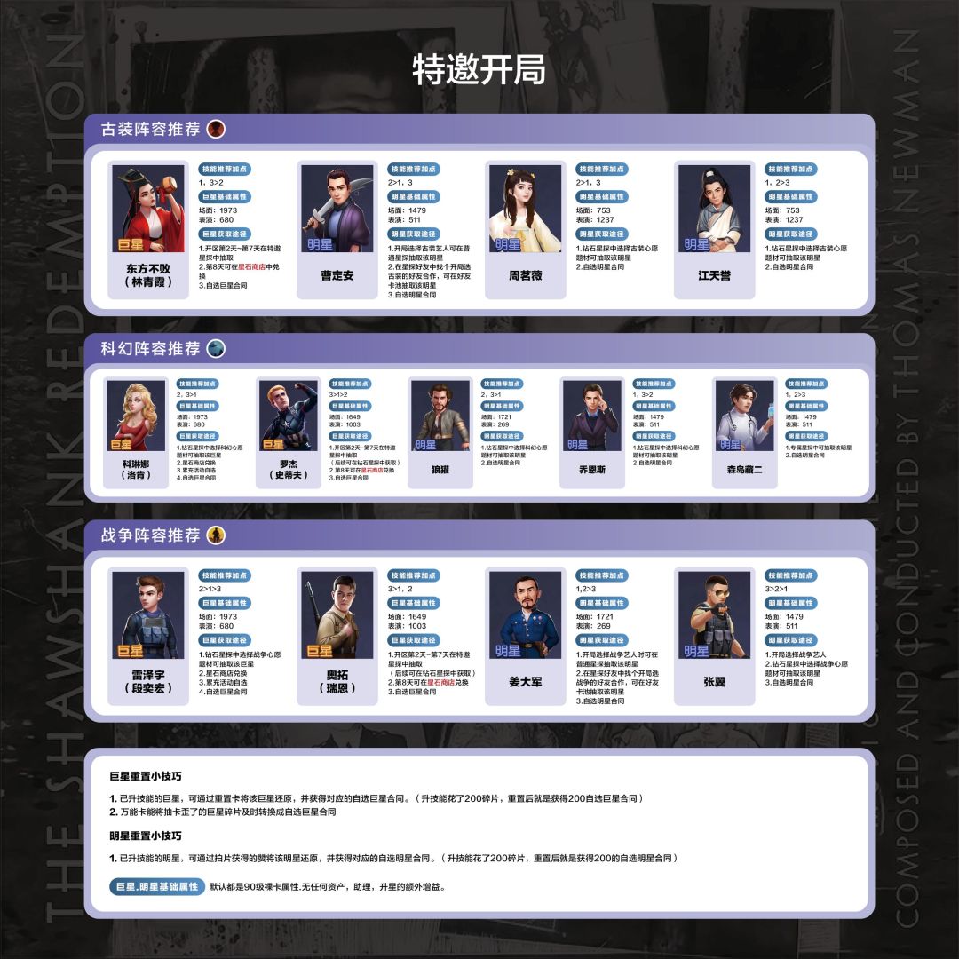 2.以下攻略主要精细的说明了一赛季氪金有限的情况,如何选择最佳、最强的巨星进行培养,以及剧本选择,场景需要注意的事项