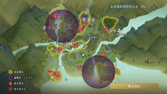 开局选落点我们可以得到的信息就是轰炸区(紫圈)资源区(黄圈)