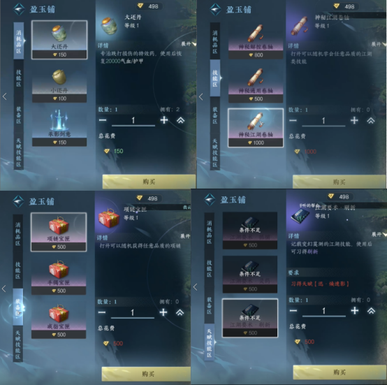 另外仙居原内还可以通过完成任务/探索/击败获取游戏内货币“玉骨牌”拿着玉骨牌我们就可以去盈玉铺区购买货物(药品/技能/装备/天赋技能)这也是我们获取装备/技能的一个绝佳选择。