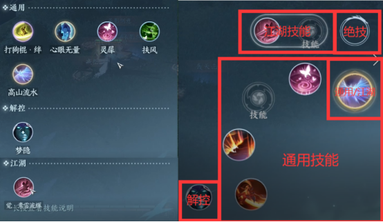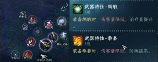 每个流派的武器必定携带该流派的两个技能和普攻,其中的素问与铁衣流派则会获得削减伤害来提升治疗/防御能力的BUFF
