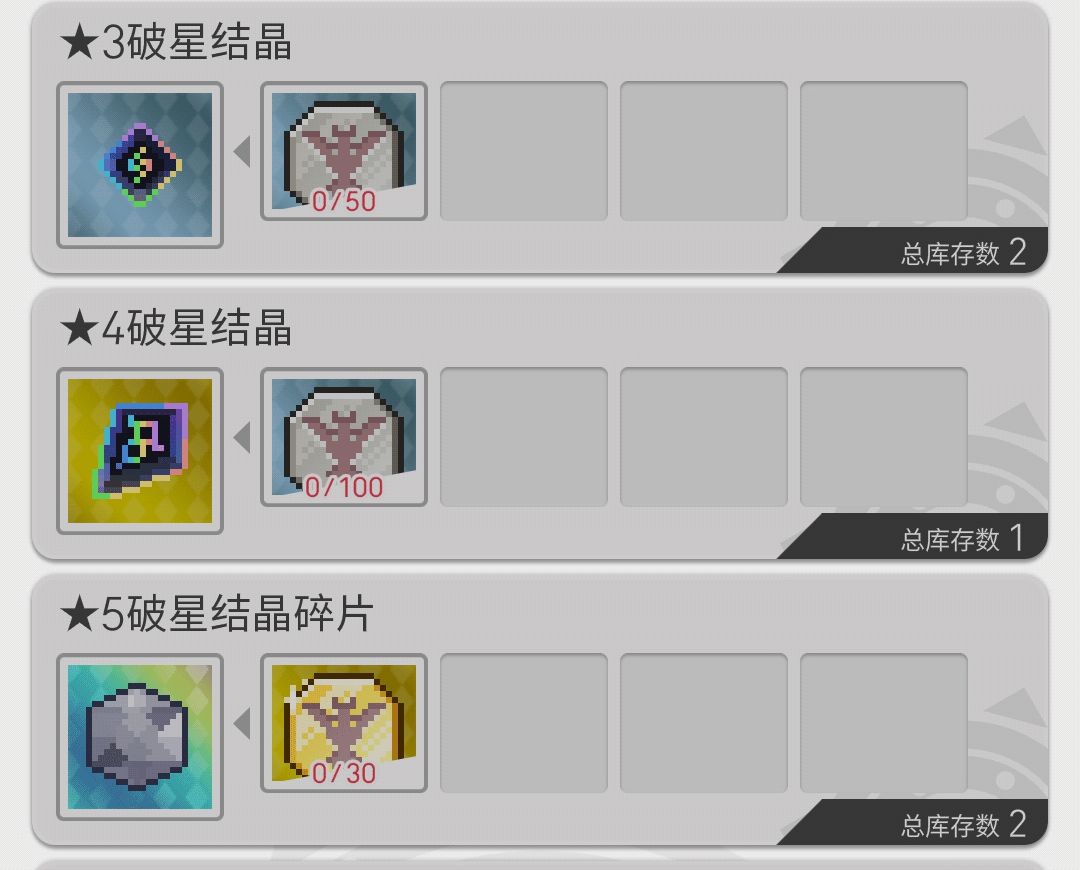 到达上限后,需要使用一个重复角色或对应星级的破星结晶进行突破,每次突破提高5级上限。三星以下角色统一使用“3破星结晶”(名字就叫这个,3不是数量),四星和五星需要使用对应星级的材料。