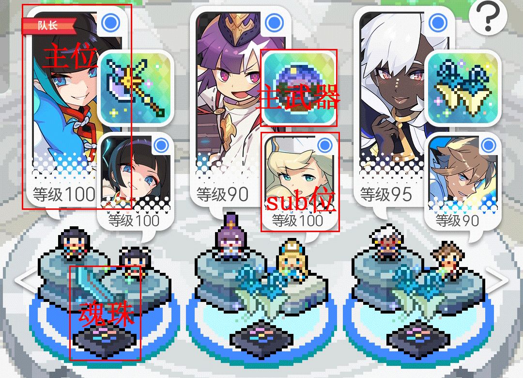 编队界面的主位、sub位、主武器、魂珠位置如下。注意,魂珠是带在主位角色上的,sub位的魂珠不生效。