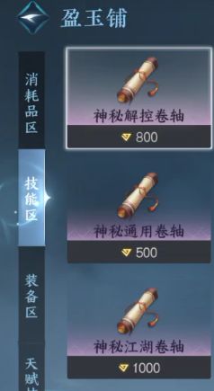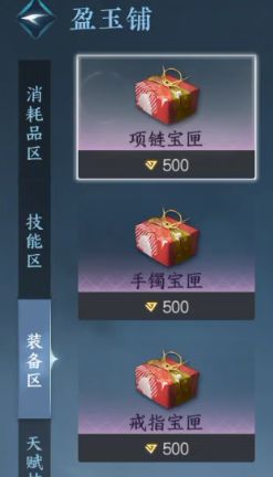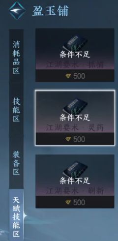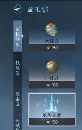 盈玉铺的物资分为四大类别,消耗品,技能区,装备区,天赋技能区。