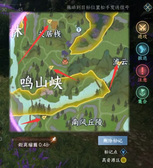 捡到3个大剑可以学习到一个绝技【御剑飞行】。右上角的跑毒倒计时比较快,时间为(2:30),(1:48),(1:38),(1:18)分钟。毒圈缩圈次数是4次,到第四次的时候差不多就到决赛圈了,大家要提前跑毒,不然遇到各种大山的时候就不好跑了。