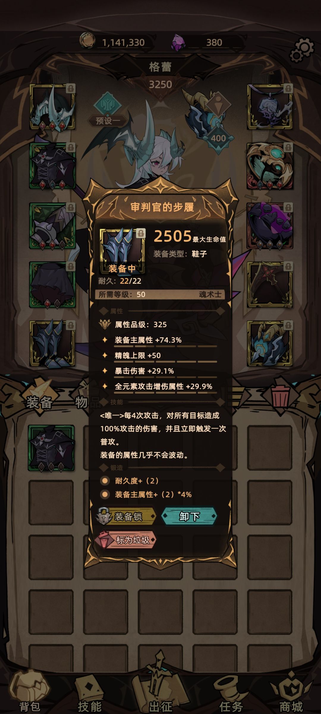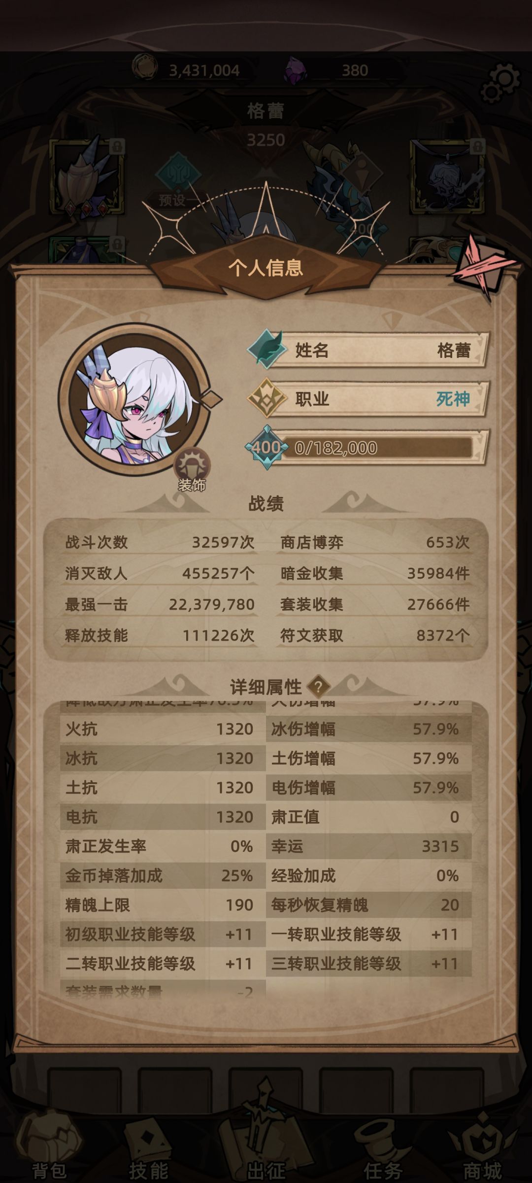 属性因为套装的词条浮动 所以只需要保证某些关键属性即可 80%以上的肃正 10全技能 15%以上的暴击 100%的穿透(可有可无) 然后尽量提升攻击与爆伤即可 死神不需要防御!(震声)