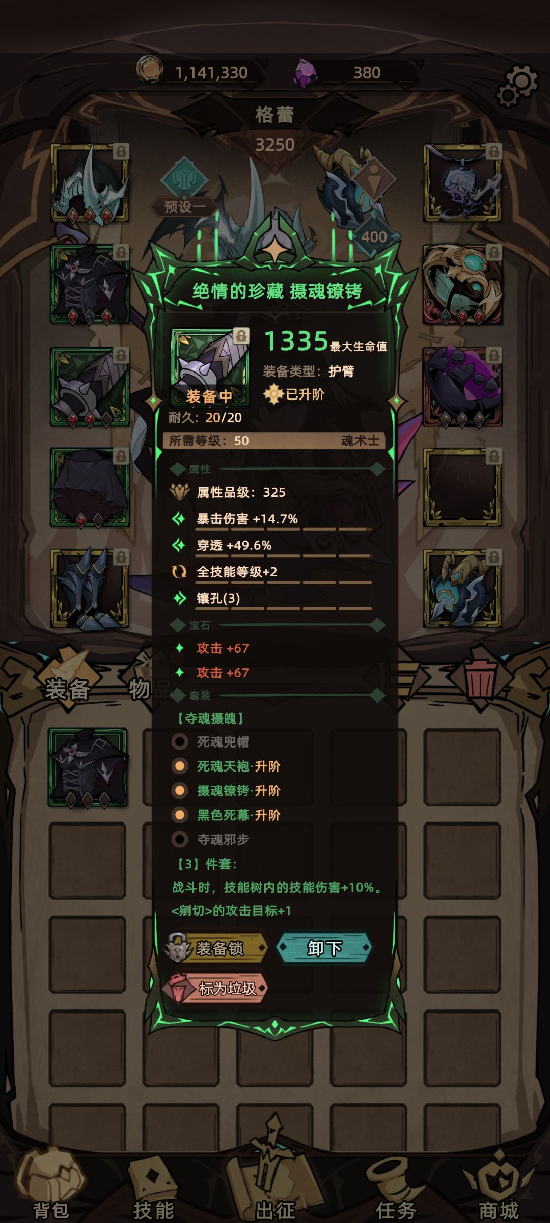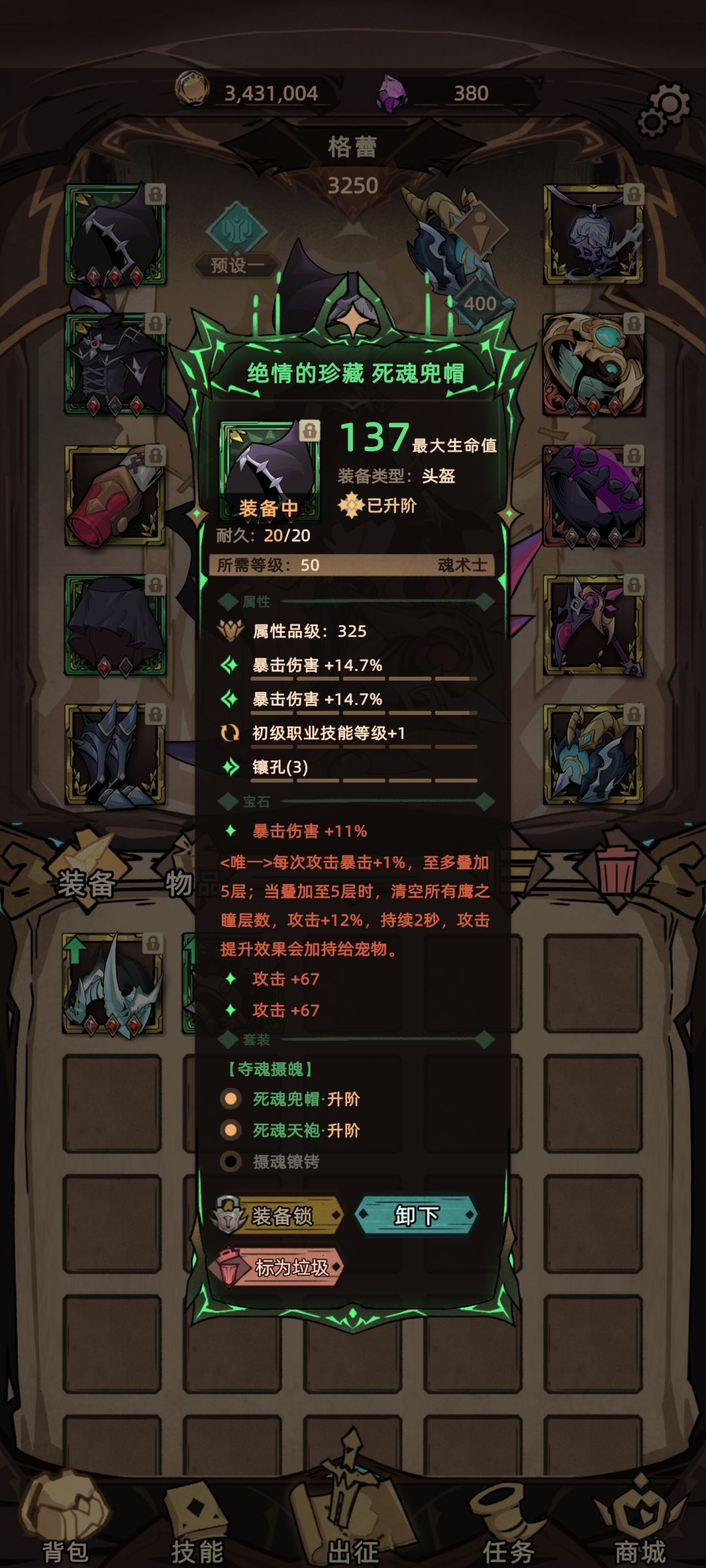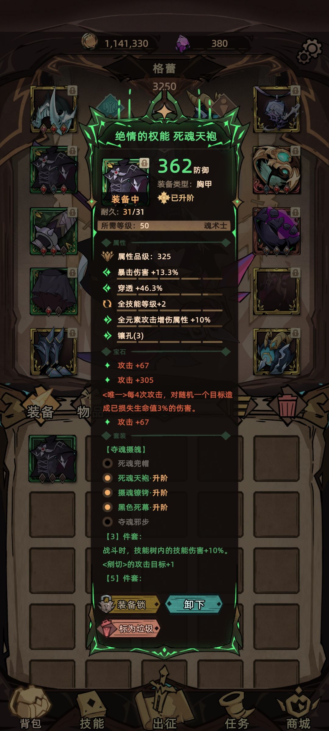 还有个人建议 套装装备中最好选择一件带有穿透词条 最好保障100%穿透 死神普攻连带的技能并非真伤 是需要穿透的 但是那几个技能其实对伤害影响不大