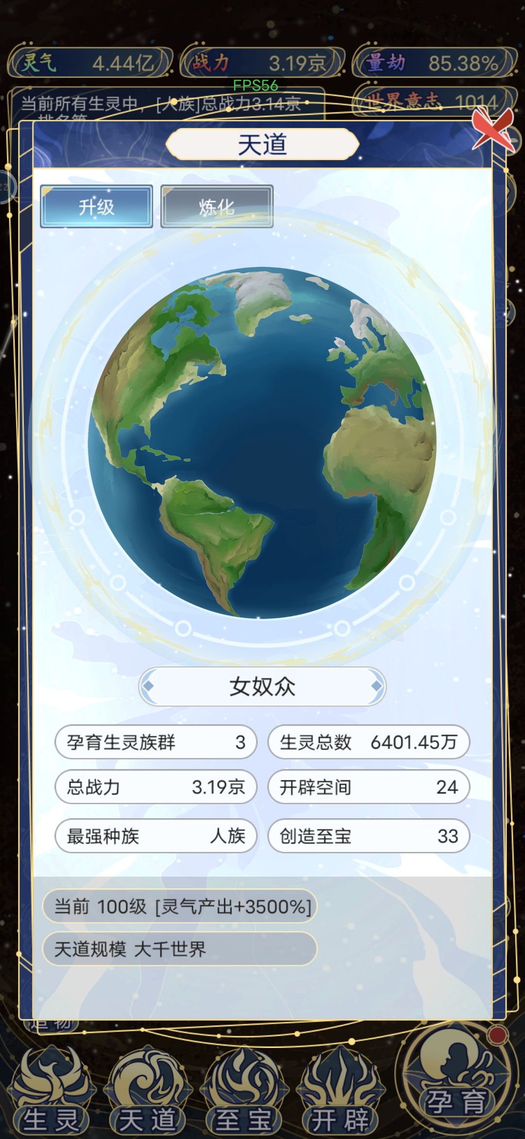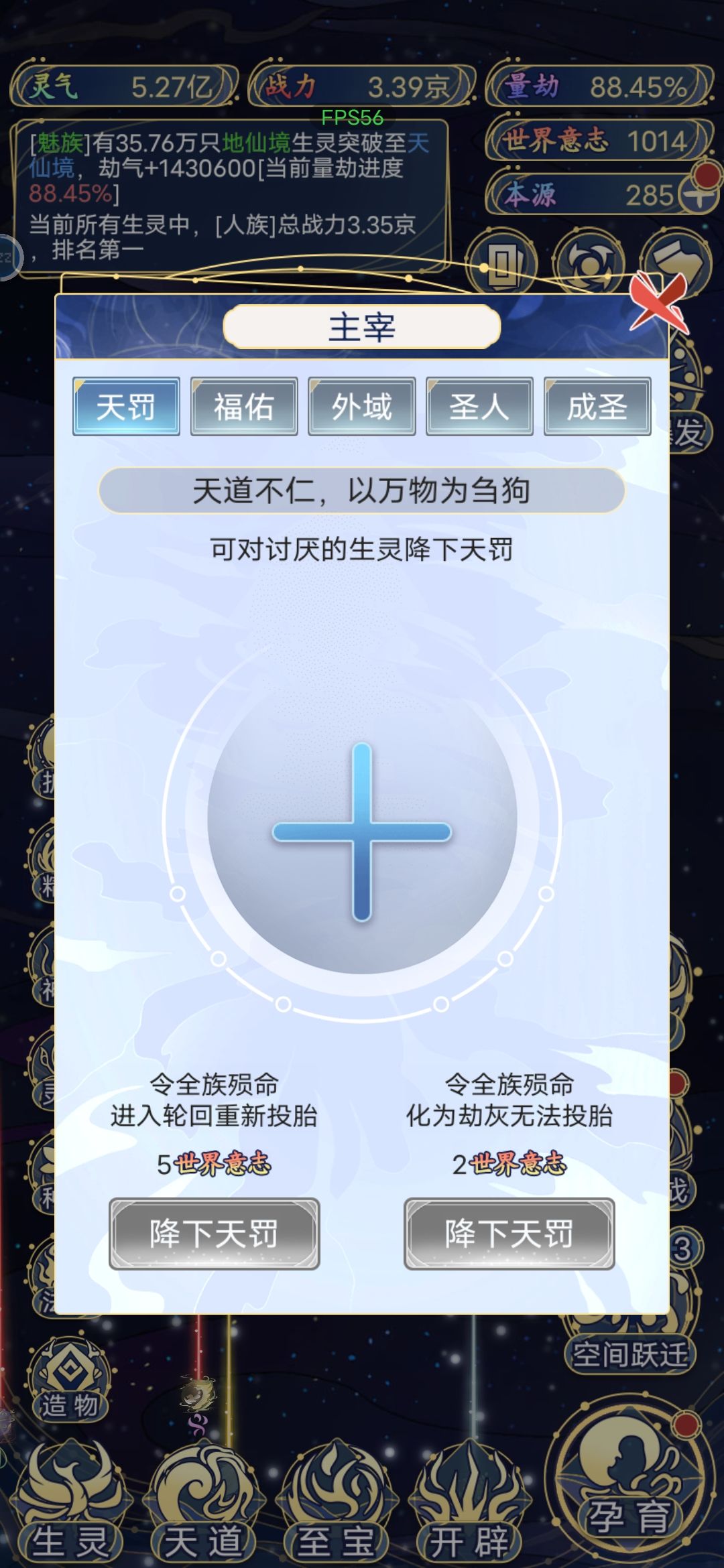 前期单人族,诸神之战开启第二族,然后不要再孕育新种族。大千世界后挑两个喜欢的种族,剩下全部给天罚灭了,天罚在主宰里,随世界等级开,福佑记得升级,圣人升级全点人类。