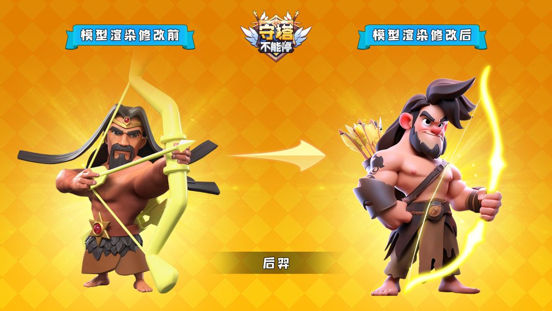 本次后羿的模型也进行了重新设计。旧版后羿形象黝黑的肌肤以及古板的面容设计,衬托的气质不像一位勇士,反而更像一位朴素的猎人。而新版后羿的形象更加年轻、更加孔武有力、更加意气风发。那种自信的表情,仿佛九天之上的三足金乌也只是手到擒来的猎物一般。