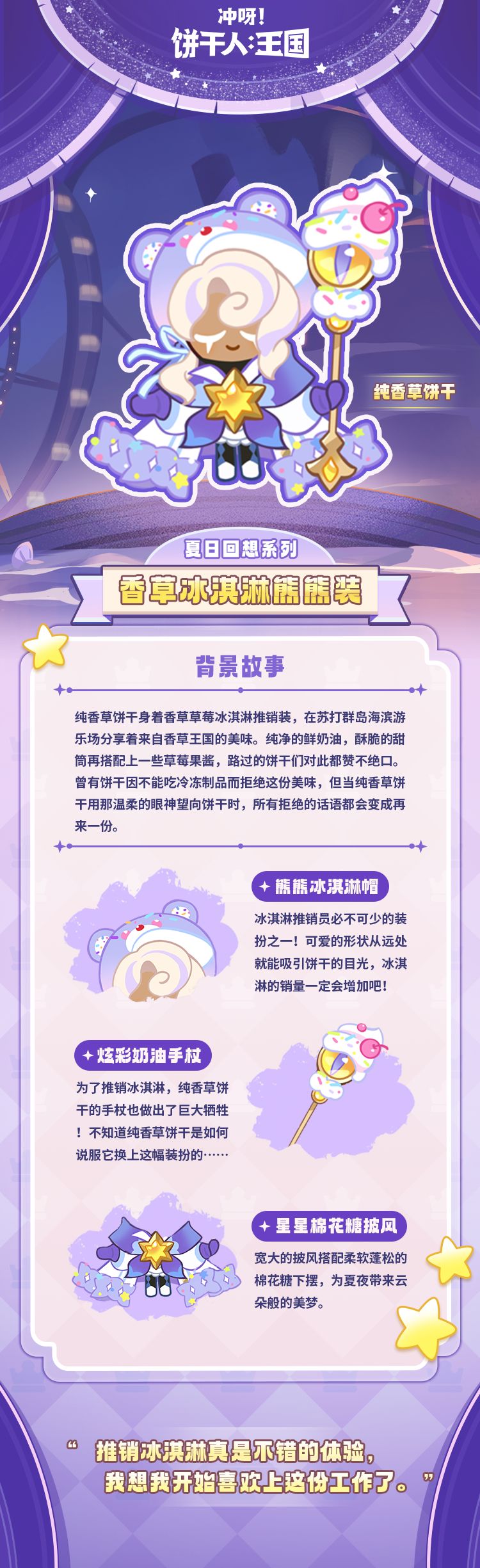 纯香草饼干身着香草草莓冰淇淋推销装,在苏打群岛海滨游乐场分享着来自香草王国的美味。