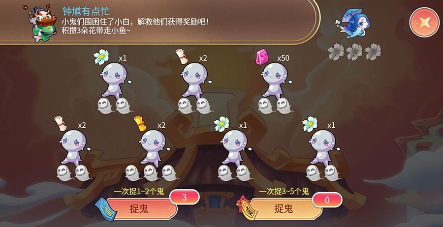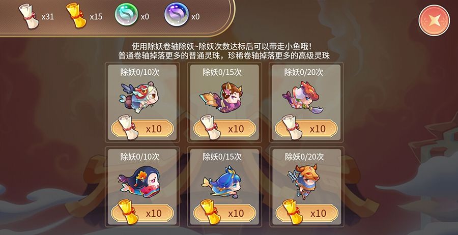 在除妖环节中,需要我们选择对应的小鱼并消耗卷轴来开始<除妖>。尽全力的攻击小怪,收集两种颜色的灵珠,用来兑换新鱼奖励。