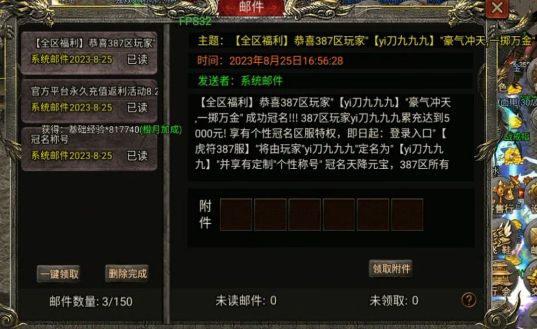 【全区福利】恭喜387区玩家"【yi刀九九九】"豪气冲天,一掷万金" 成功冠名!!! 387区玩家yi刀九九九累充达到5000元! 享有个性冠名区服特权,即日起:登录入口"【虎符387服】"将由玩家"yi刀九九九"定名为"【yi刀九九九】"并享有定制"个性称号" 冠名天降元宝,387区所有玩家系统发放元宝*800奖励,与之同庆!