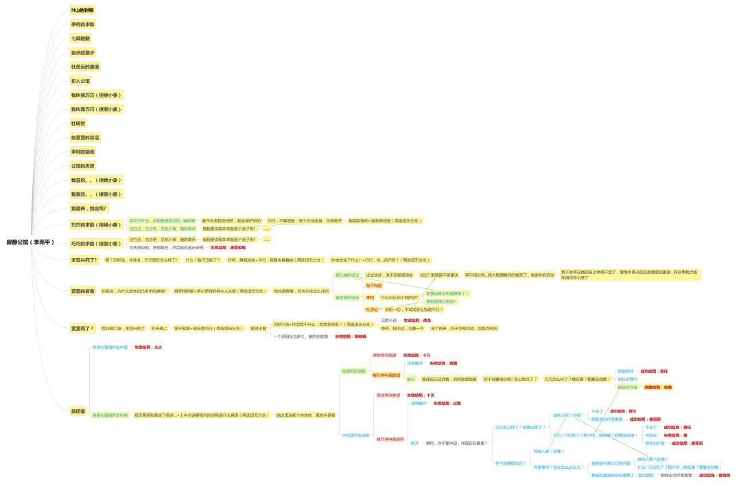图中所有结局红色加粗,黄底为完美结局可选择路线,所有节点对话会影响下一节点对话的已用蓝字标出,重要节点为红字标出。图片用原图下载放大查看即可看清