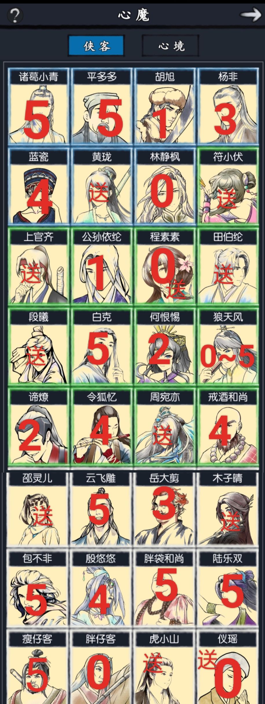 优先级如图,0是开局几乎必须拿到的,1是前期,2是中期,3是后期,4是大后期需要的,5是可有可无的或者只有特定关卡需要的,前期抽出0的侠客就是完美开局了,其他的侠客越接近前期发展越好。亲密伙伴宁愿卡关也要留着!!
