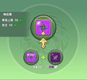 1.如下图所示,合成紫色1星的梅花镖,除了需要主体装备(紫色0星梅花镖)以外,还需要一件紫色0星武器作为材料,因为系统没有指定需要哪种武器,所以任何紫色0星武器都可以成为材料。