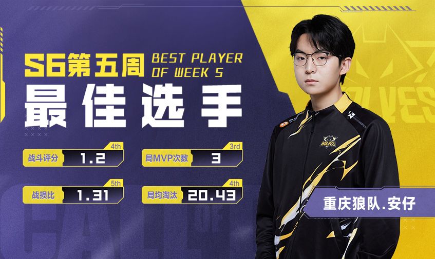在综合衡量上周选手个人发挥及战队成绩后,重庆狼队.安仔再次当选周最佳选手!