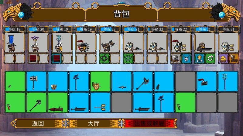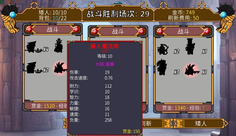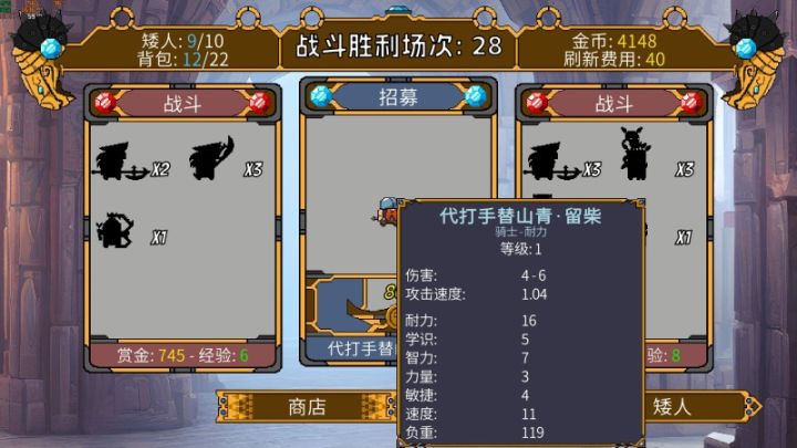 在商店界面,玩家可以查看关卡敌人的兵种构成和敌人技能,例如,当遇到雷法师时,可以携带增强雷抗性装备。当商店里敌人太强时,可以消耗金币刷新商店。在战斗中,玩家的矮人军团阵亡战败游戏即可结束,因此需要观察战局使用撤退或者直接alt+f4闪退。