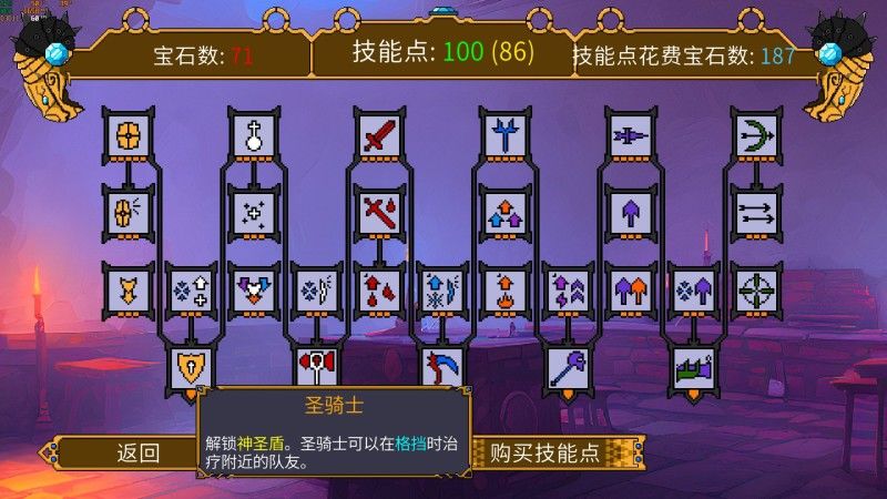 技能树共有六大类40项,通过消耗宝石可以购买技能点来激活强大的增益效果。但是,技能树不会重置,重生后仍然保留,游戏提供了三条队伍存档,每一条队伍都有专属的技能点亮方向。“盗贼之贪”可以增加宝箱掉落概率和初始金币数,“连射”让弓箭手有概率射出第二只箭,“嗜血”会对敌人造成“流血”效果并偷取一定生命值。