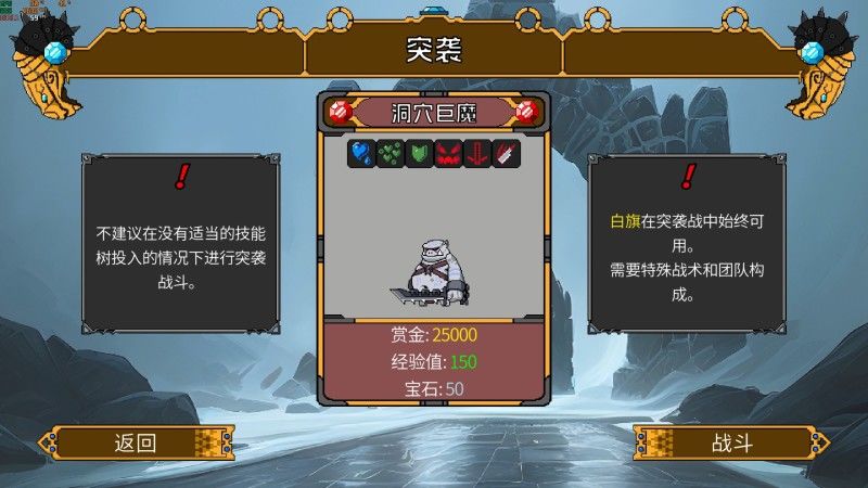 在一定回合数后,游戏将解锁突袭模式,出现单体BOSS,例如“洞穴巨魔”,拥有强大的属性和主被动技能。玩家需要根据BOSS的特性来选择团队构成,“洞穴巨魔”免疫冰冻,因此不上场冰系法师。