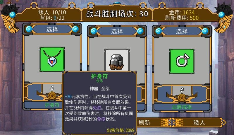 每隔十波战斗,商店便会刷新三选一的神器,神器拥有强大的效果,例如“护身符”增加元素伤害抗性并在受到致命伤害时获得“免疫效果”,“金矿石”增加负重并在升级时获得金币。