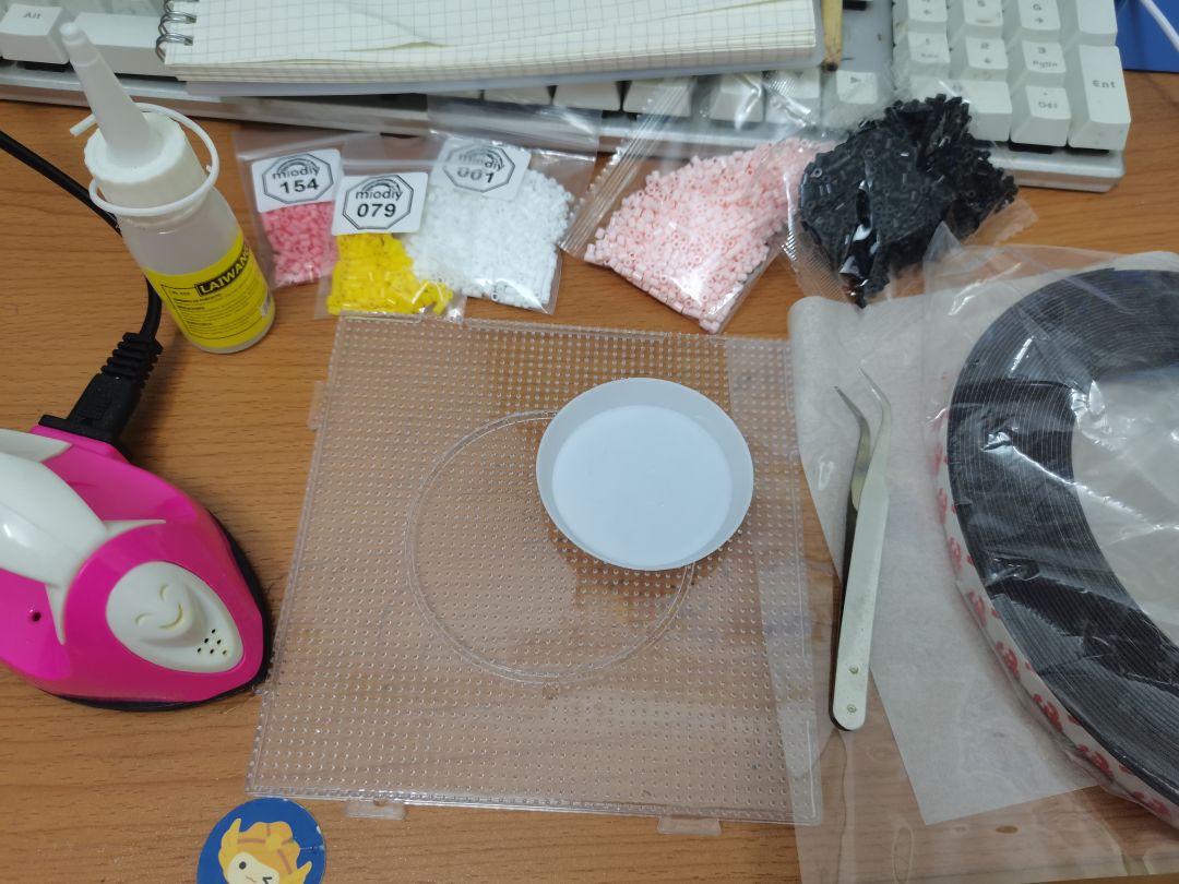准备材料有:1.对应的颜色豆子2.6mm,2.磁贴(自带双面胶)3.小豆模板,4.手工胶水,5.小烫斗,6.白色小碟(装豆用),7.透明烫片+油纸各1张,8.镊子