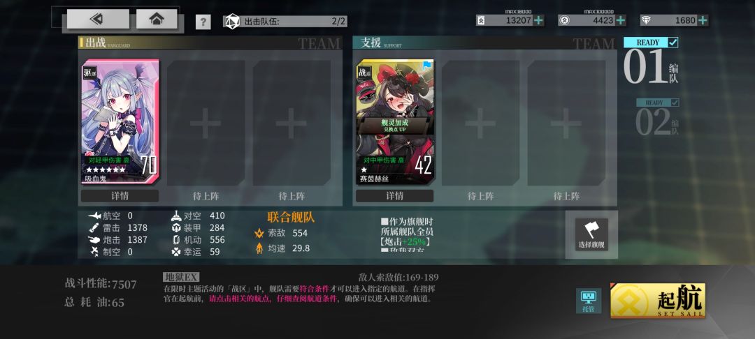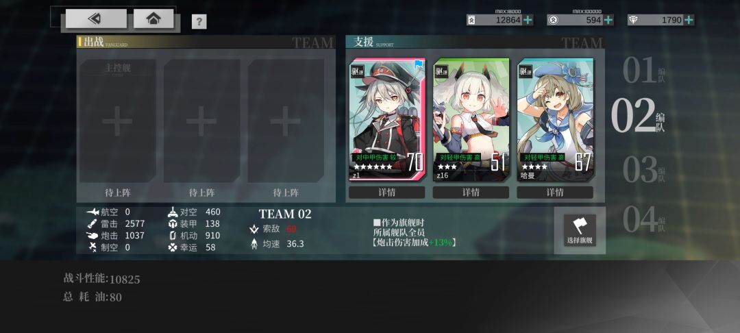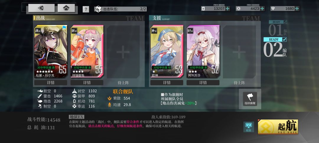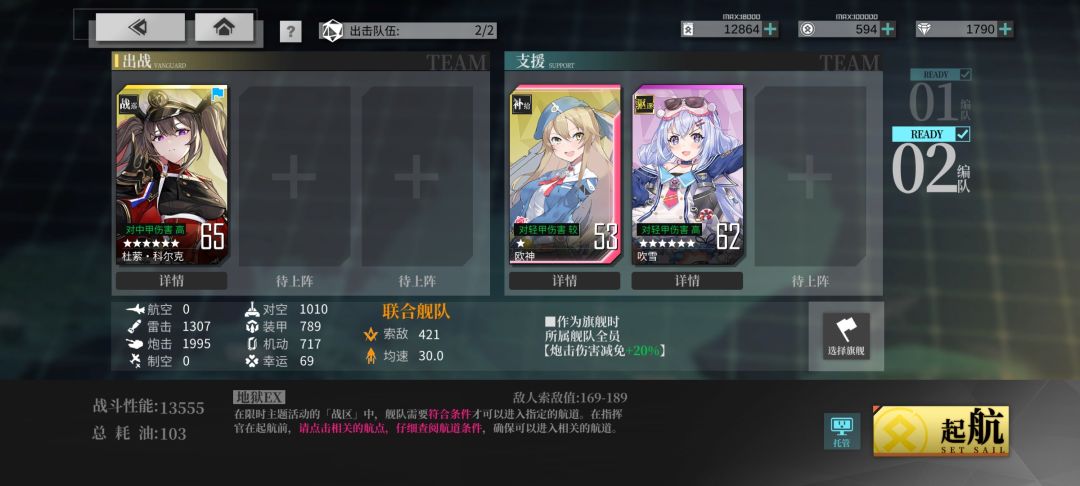线路2女灶神专属路线,C-D的低速条件常规船满足不了,高索敌到还好说。我配的队伍里还没开誓约的设备格,稍微练下可以下了轻巡奶,油耗就和1路持平了。相对1路这条路道中难度大幅降低,即使1路设备带对空三式也没有这条路稳。有女灶神的强推线路