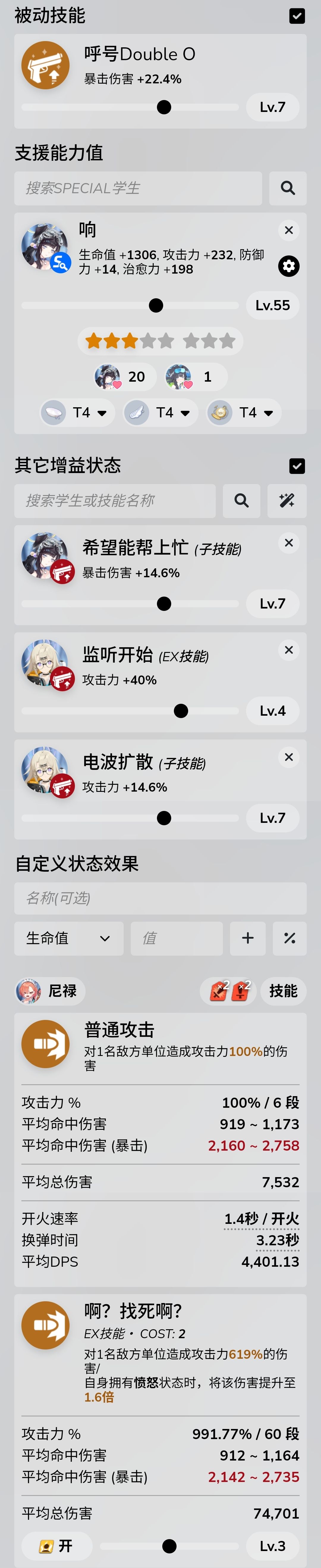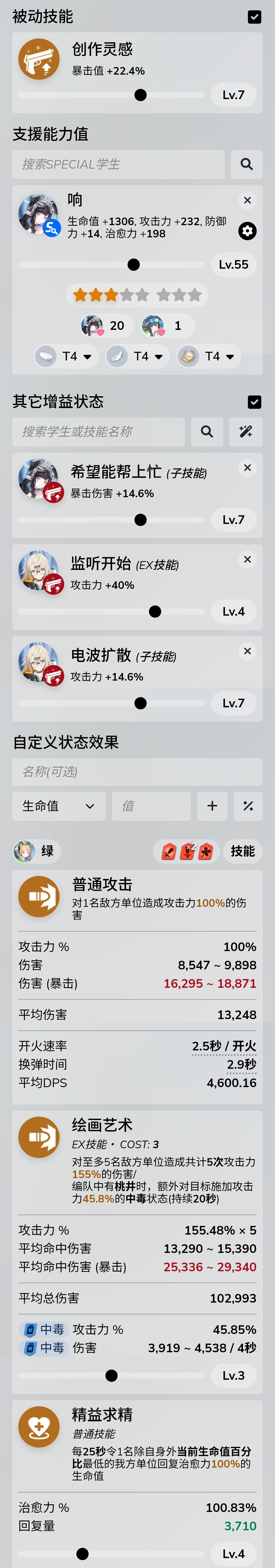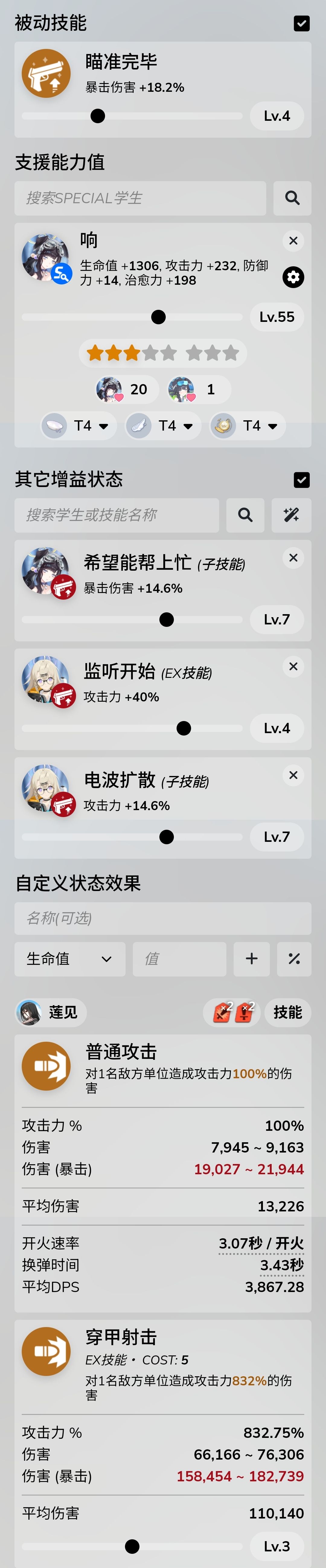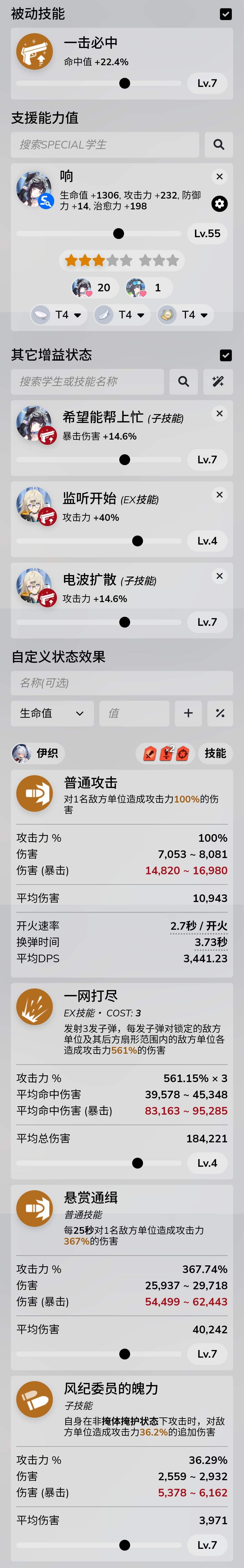 刚需:突击位三星伊织(55级t5,技能4777),支援位小玉(4117),响(4117,没有也行,就是伤害会极限一些)