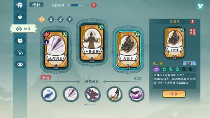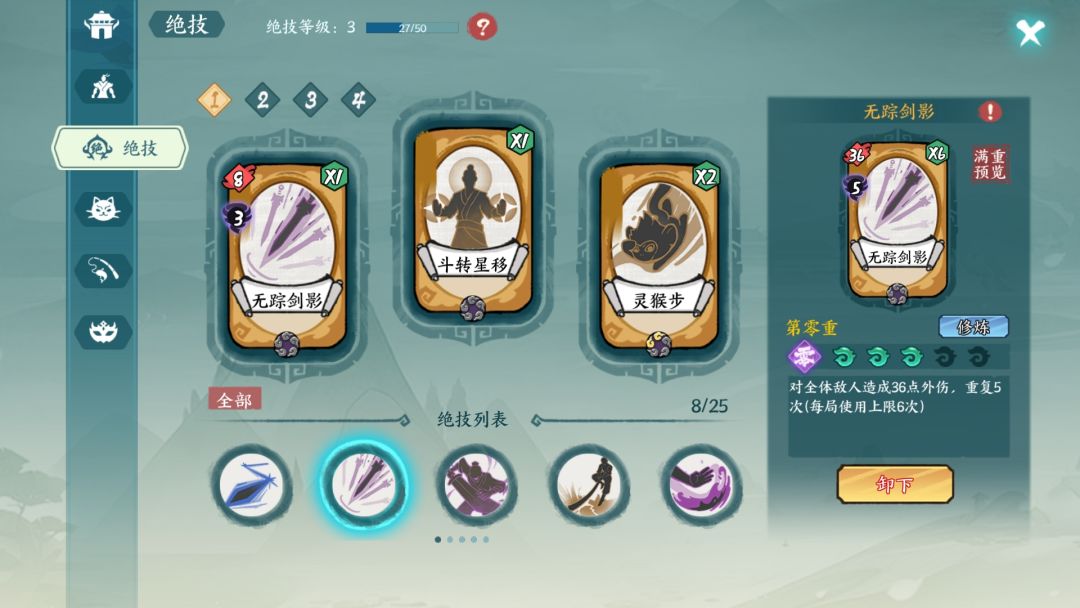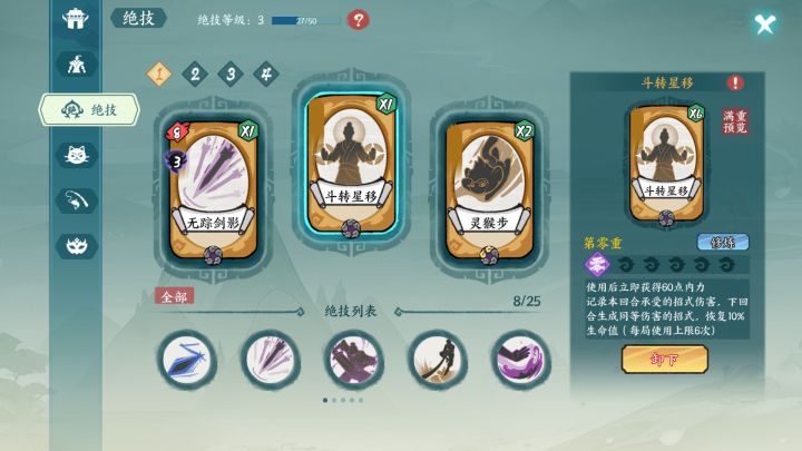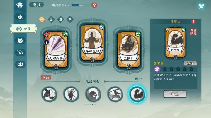 斗转可以过渡,赤练那个绝技感觉不是特别有用,猴儿步首推,过牌神技,剑影实测可以出发裂伤,也有用,神臂也可以,不过前期感觉拿不到,在后面的地图里面,好了就这样了,以后有新的我再来补充![[嗒啦啦4_你不对劲]](https://img.tapimg.com/market/images/4f590ff2af7824fb6e53d552c258b015.gif)