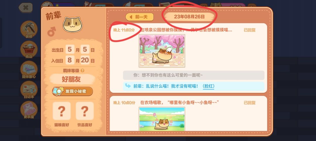 注意这一篇帖子发布时间,写的时候是23年8月26号1:20,今天登录去猫宿舍看每天日记更新了啥,结果一整天的内容都出来了,但是内容全是前一天的
