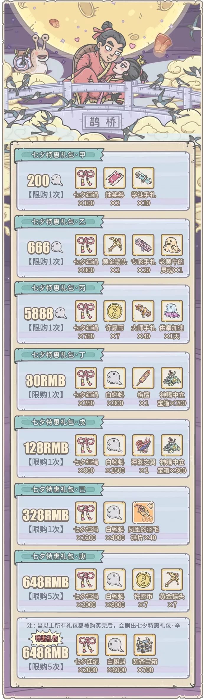 2.礼包只有一天,而牛郎700有,则白嫖最多5150七夕红绳,个人建议换2次777白蝌蚪,一次天堂护符,一次2020白蝌蚪,一次AAA紫贵,共消耗5000七夕红绳。