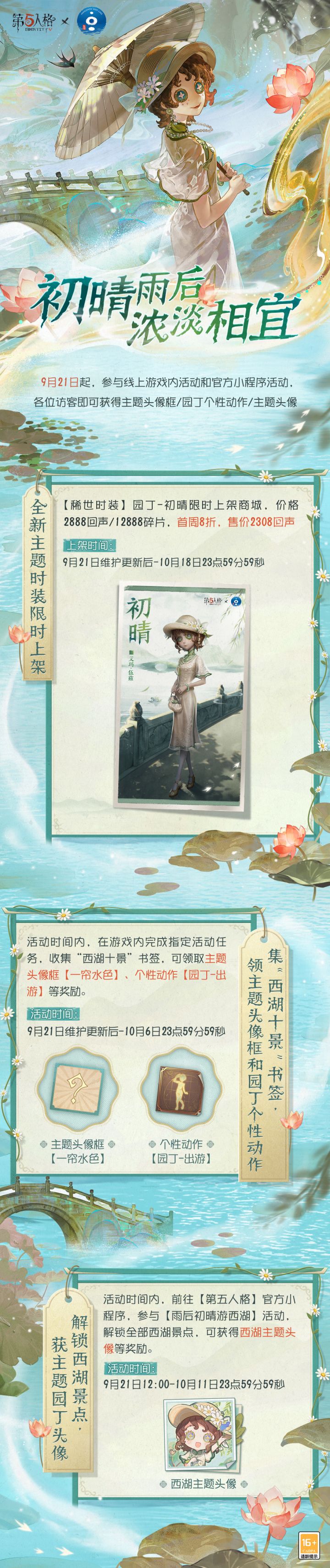 第五人格×杭州西湖景区全新主题【稀世时装】园丁- 初晴将于9月21日限时上架商城。