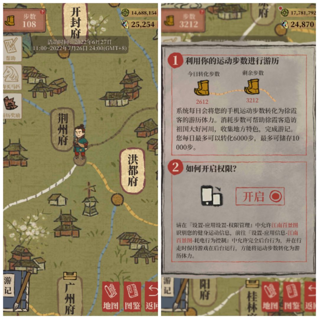 原玩法:现实中的步数可转化为游戏中徐霞客游历名山大川的步数,探索完成解锁奖励(和朝板一样分普通版和进阶版)。