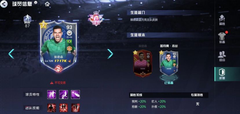 福登有巅峰赛的30皮可以用,穿上能力就有92了,所以必选,突破也不难,盒子及限时球探。丁丁的获取难度稍微大一些,非梅罗的90~93盒子,还有就是限时球探抽取和兑换,作为曼城的中场大师和门面,在难也得用一下。罗德里,有20皮可以用,后场又不想放很多人,以后我是选择1后卫的准备,所以没弄沃克,罗德里暂时也是用着,我感觉后面还是会换掉。拉比奥,50皮,主要看上了技能回体,前期还是很不错的,恩佐拿不到,在慢慢攒皮肤随便中,这里我说一句,不是氪金大佬,玩一整套欧冠皮,肯定要混搭的,所以也别太在意是否是曼城的。