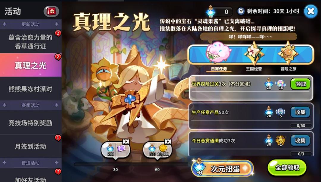 完成活动任务可获取真理之光来抽取纯香草饼干,其中日常任务每日会刷新,可重复完成,王国经营和冒险之旅任务有次数限制,可根据任务剩余数量完成对应次数的任务,领取奖励。推荐日常任务优先做完,王国经营和冒险之旅前期可以一边推图一边做。
