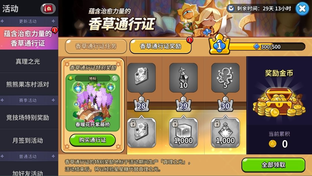 伴随着的还有香草通行证,可以获得大量资源。香草通行证在活动期间内每天会产出真理之光,推荐尽早购买性价比最高,ps:活动过后将会变为产出星星糖。