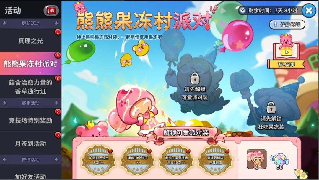 熊熊果冻村派对需要根据任务指引,完成下方活动需求,完成第一阶段任务,解锁可爱派对装后即可进入到果冻存派对第二阶段任务,后续任务以此类推~完成上一阶段任务后解锁下阶,当任务全部解锁完后可以获得初始三小只的服装啦!