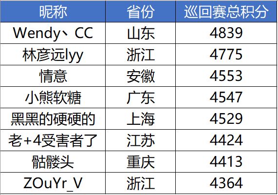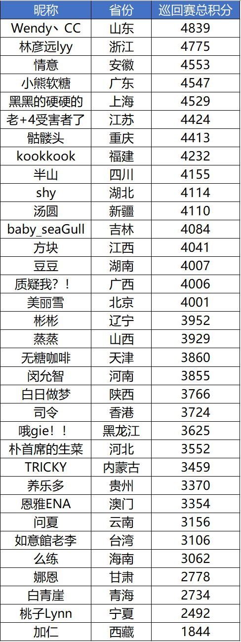 来自安徽的“情意”本周压力属实不小,在ta之后的广东玩家来势汹汹,曾经剑指本次预赛冠军!不过,在一周的较量结束后,“情意”以六分的微弱优势,将前三名的大门牢牢关上,没有再给其他各省玩家造次的机会!