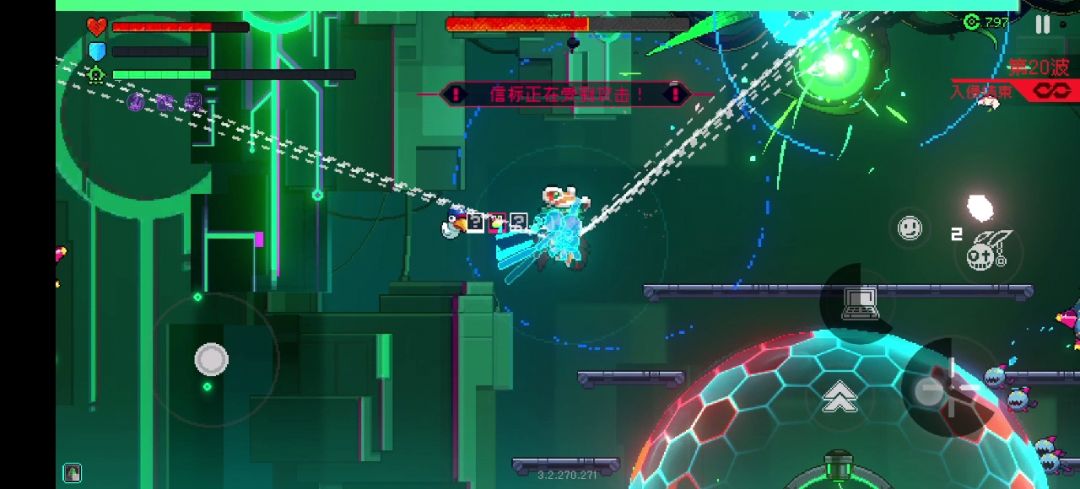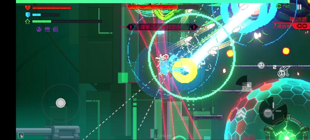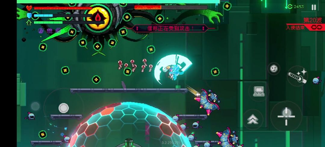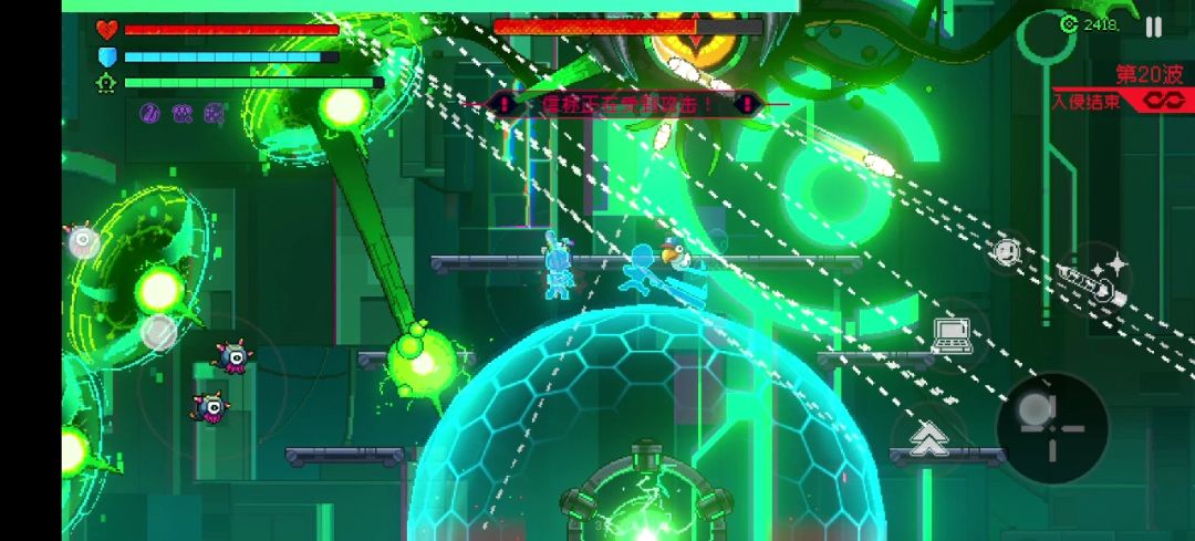 其次BOSS还会释放两用种普通弹幕攻击,一种散弹,一种聚集形状弹幕,这两种弹幕可以用过环形球消除,伤害不高不用躲,血量健康的话用环形球的弹幕消除能力硬顶就好,尽量远离罩子或站在BOSS和罩子中间进行抵挡弹幕消除,根据罩子状态选择。务必保护好罩子,它很脆弱