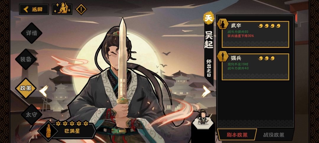 2,吴起商鞅作为一队老搭档,开局可以拍出170的超高战力。而且,商鞅太守可以压消耗,所以可以多点粮食消耗的战力军规时代政策。