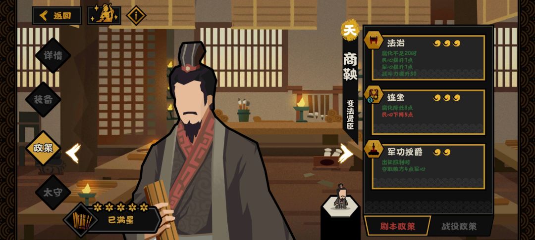 2,开局发挥商鞅太守技能,降低消耗,配合粮食消耗的时代政策在前期也能取得一定优势。