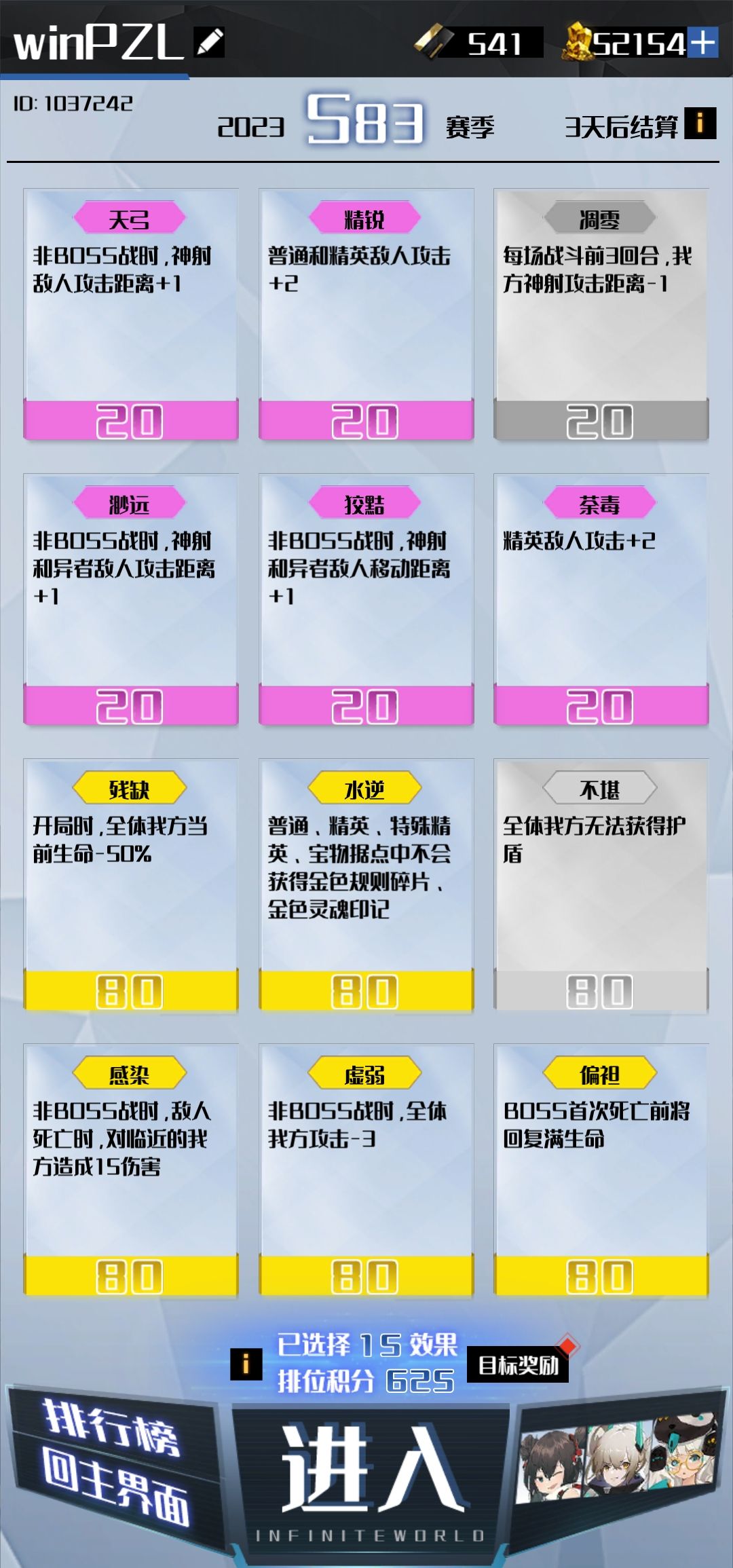 难点:无护盾“不堪”(默认不选),射手变白板(禁天赋减射程),其他紫色、金色词条叠加(多重阴间体验),开局前三关生存,一图BOSS关通关。